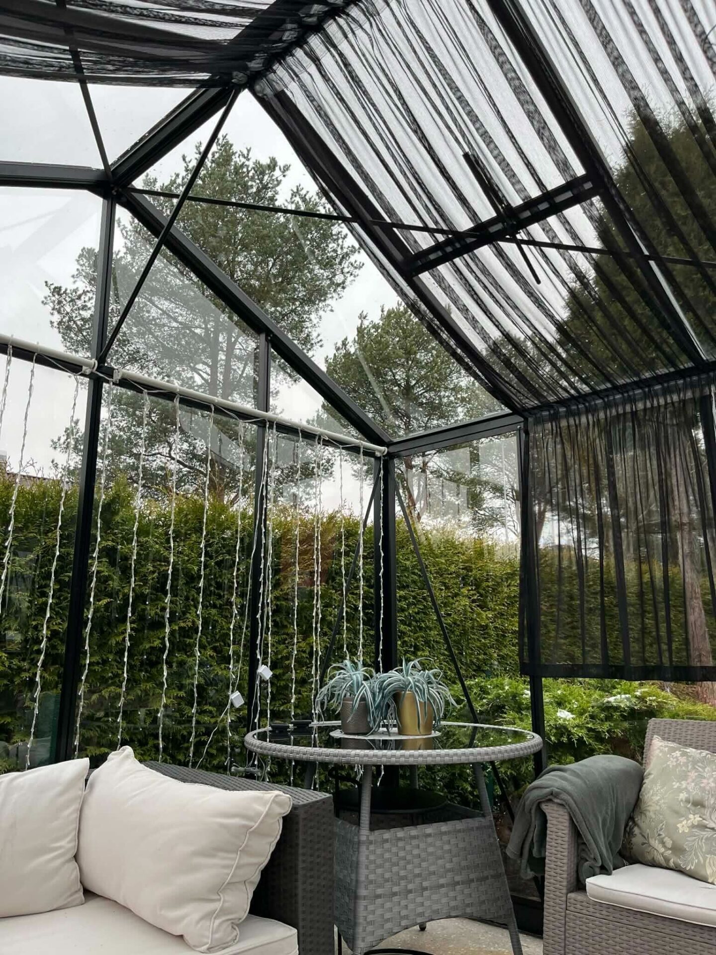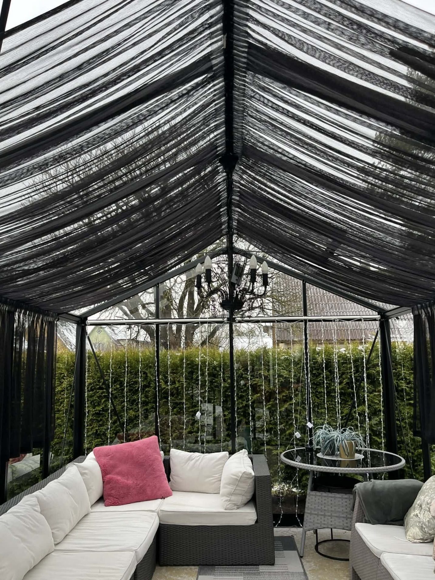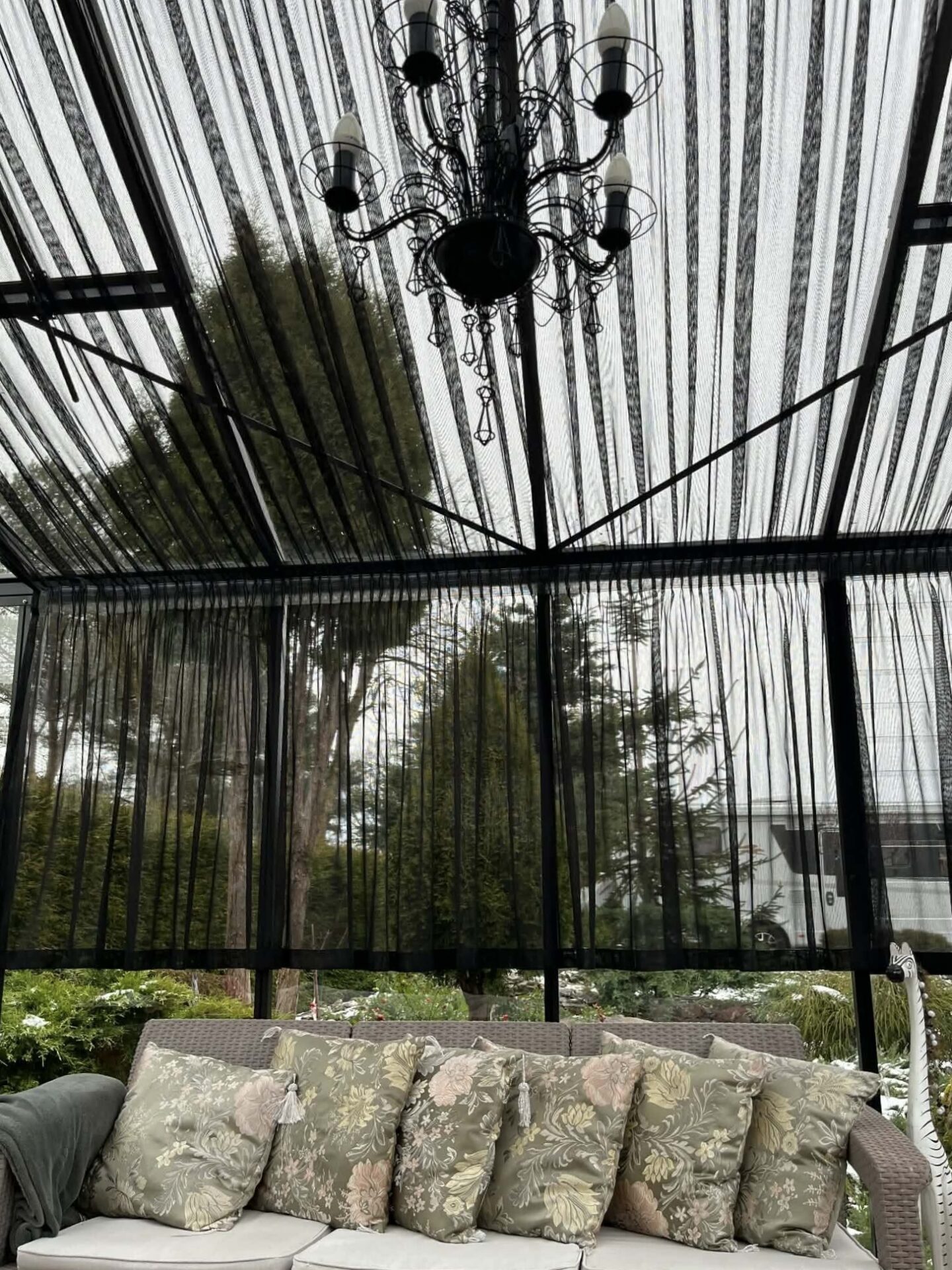 Mustad võrktüllkardinad annavad Põlva talveaiale elegantse ja modernse ilme, säilitades ruumi avaruse ja valgusküllasuse.
